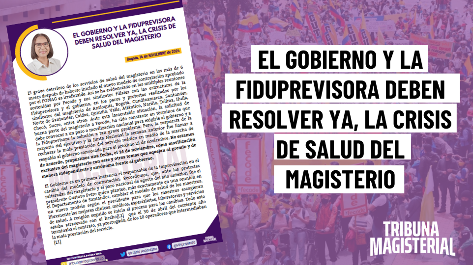 El grave deterioro de los servicios de salud del magisterio en los más de 6 meses después de haberse iniciado el nuevo modelo de contratación aprobado por el FOMAG es irrefutable. Así se ha evidenciado en las múltiples reuniones sostenidas por Fecode y sus sindicatos filiales con las estructuras de la Fiduprevisora y el gobierno, en los paros y protestas realizados por los sindicatos del magisterio de Antioquia, Bogotá, Cundinamarca, Santander, Norte de Santander, Caldas, Quindío, Valle, Atlántico, Nariño, Tolima, Huila, Chocó, Sucre, entre otros. Ante esta lamentable situación, la solicitud de buena parte del magisterio a Fecode, ha sido constante en términos de que debe convocar a un paro o movilización nacional para exigirle al gobierno y a la Fiduprevisora la solución a tan grave problema. Pero, la respuesta de la mayoría del ejecutivo y la Junta Nacional la semana anterior fue llamar a rechazar la mala prestación del servicio médico en medio de la marcha de respaldo al gobierno convocada para el próximo 21 de noviembre. No estamos de acuerdo, propusimos una fecha, el 14 de noviembre, como movilización exclusiva del magisterio con este y otros temas que aquejan al gremio y de manera independiente y autónoma frente al gobierno.