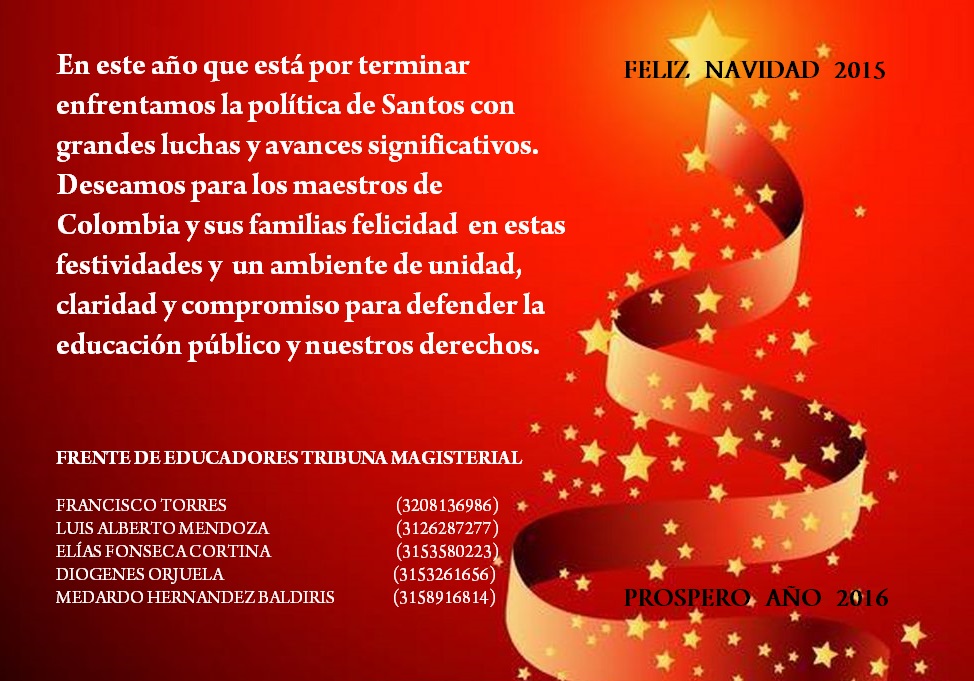 En este año que está por terminar enfrentamos la política de Santos con grandes luchas y avances significativos. Deseamos para los maestros de Colombia y sus familias felicidad en estas festividades y un ambiente de unidad, claridad y compromiso para defender la educación público y nuestros derechos.