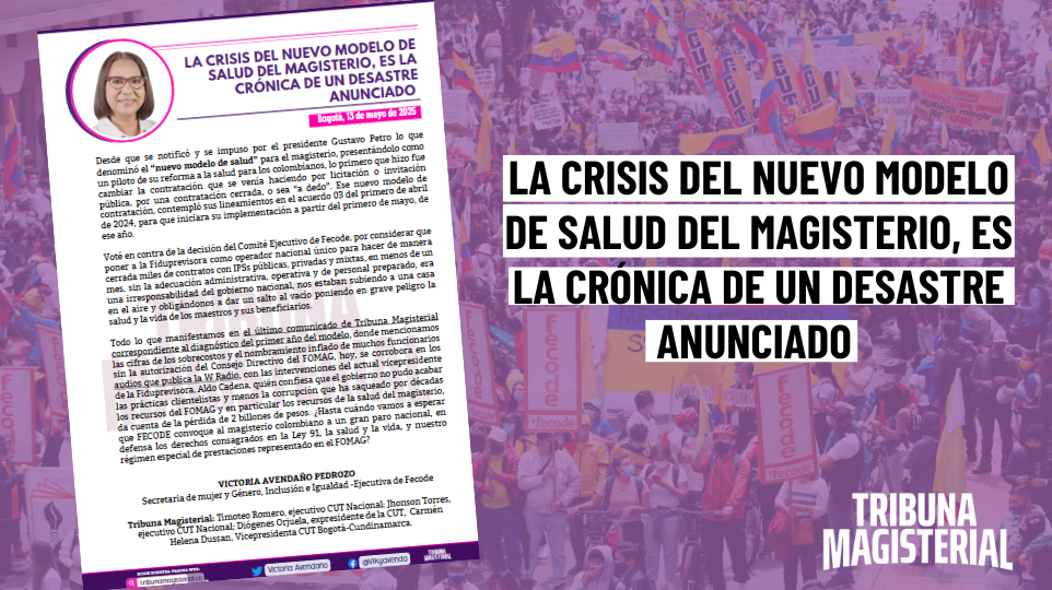 Todo lo que manifestamos en el último comunicado de Tribuna Magisterial correspondiente al diagnóstico del primer año del modelo, donde mencionamos las cifras de los sobrecostos y el nombramiento inflado de muchos funcionarios sin la autorización del Consejo Directivo del FOMAG, hoy, se corrobora en los audios que publica la W Radio, con las intervenciones del actual vicepresidente de la Fiduprevisora, Aldo Cadena, quién confiesa que el gobierno no pudo acabar las prácticas clientelistas y menos la corrupción que ha saqueado por décadas los recursos del FOMAG y en particular los recursos de la salud del magisterio, da cuenta de la pérdida de 2 billones de pesos. ¿Hasta cuándo vamos a esperar que FECODE convoque al magisterio colombiano a un gran paro nacional, en defensa los derechos consagrados en la Ley 91, la salud y la vida, y nuestro régimen especial de prestaciones representado en el FOMAG?