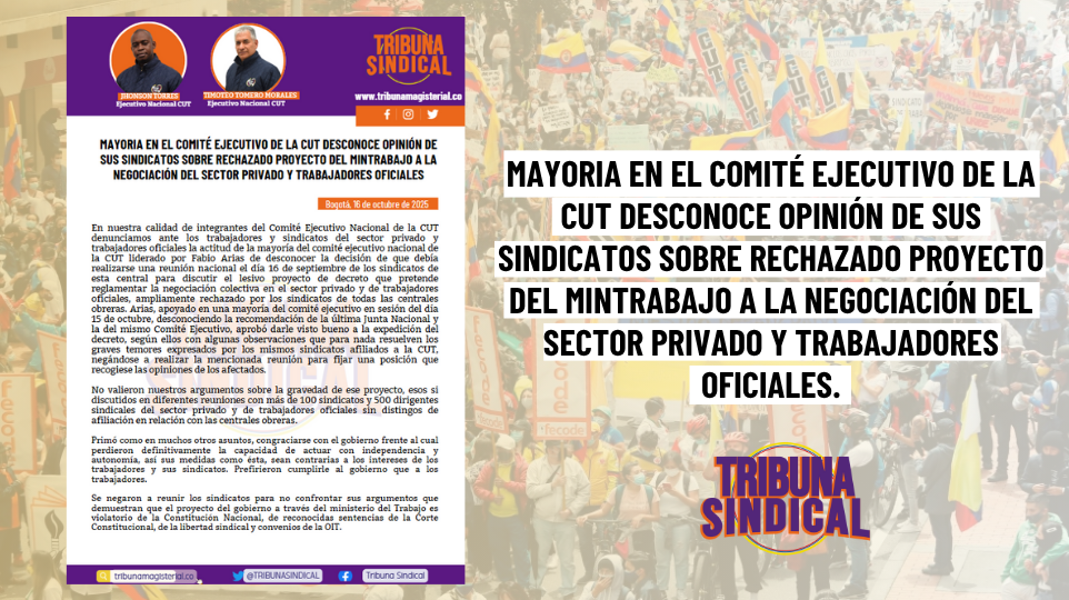 En nuestra calidad de integrantes del Comité Ejecutivo Nacional de la CUT denunciamos ante los trabajadores y sindicatos del sector privado y trabajadores oficiales la actitud de la mayoría del comité ejecutivo nacional de la CUT liderado por Fabio Arias de desconocer la decisión de que debía realizarse una reunión nacional el día 16 de septiembre de los sindicatos de esta central para discutir el lesivo proyecto de decreto que pretende reglamentar la negociación colectiva en el sector privado y de trabajadores oficiales, ampliamente rechazado por los sindicatos de todas las centrales obreras. Arias, apoyado en una mayoría del comité ejecutivo en sesión del día 15 de octubre, desconociendo la recomendación de la última Junta Nacional y la del mismo Comité Ejecutivo, aprobó darle visto bueno a la expedición del decreto, según ellos con algunas observaciones que para nada resuelven los graves temores expresados por los mismos sindicatos afiliados a la CUT, negándose a realizar la mencionada reunión para fijar una posición que recogiese las opiniones de los afectados.
