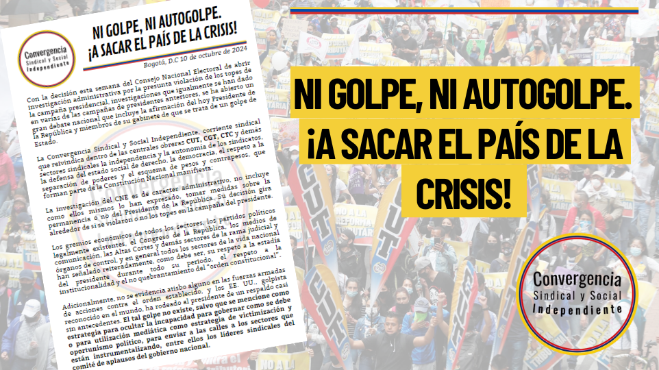 La Convergencia Sindical y Social Independiente, corriente sindical que reivindica dentro de las centrales obreras CUT, CGT, CTC y demás sectores sindicales la independencia y la autonomía de los sindicatos, la defensa del estado social de derecho, la democracia, el respeto a la separación de poderes y el esquema de pesos y contrapesos, que forman parte de la Constitución Nacional manifiesta: