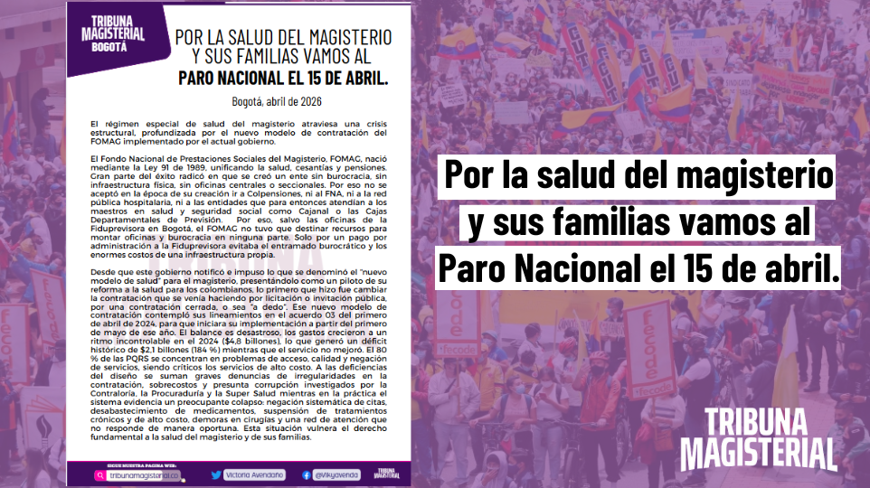 Tribuna Magisterial sale a las calles a exigir soluciones inmediatas por parte del Gobierno nacional y la Fiduprevisora para restablecer un servicio digno, eficiente y oportuno, y hace un llamado al magisterio a mantenerse unido en defensa de la Ley 91 de 1989 .
